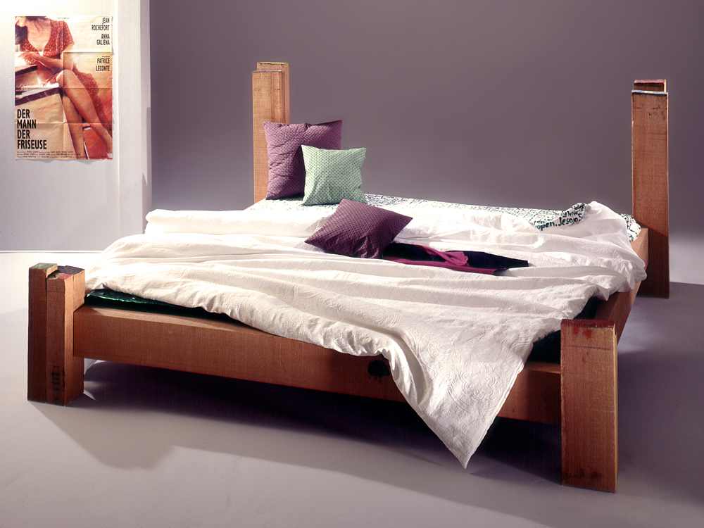 Matratze abhorchen und Bauklötzchen staunen: Bett aus naturbelassenen Meranti-Abschnitten (Holzklötzchen).