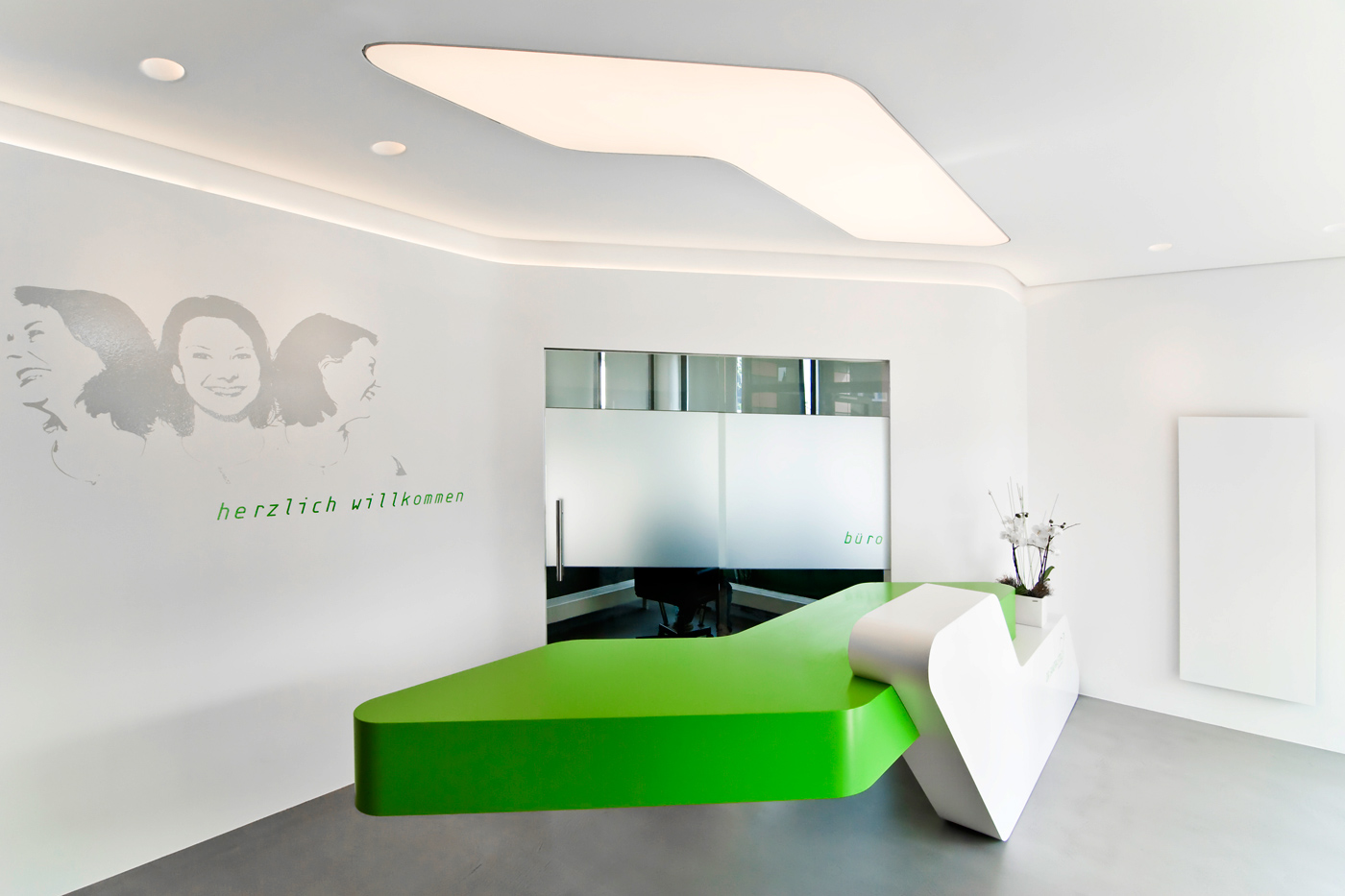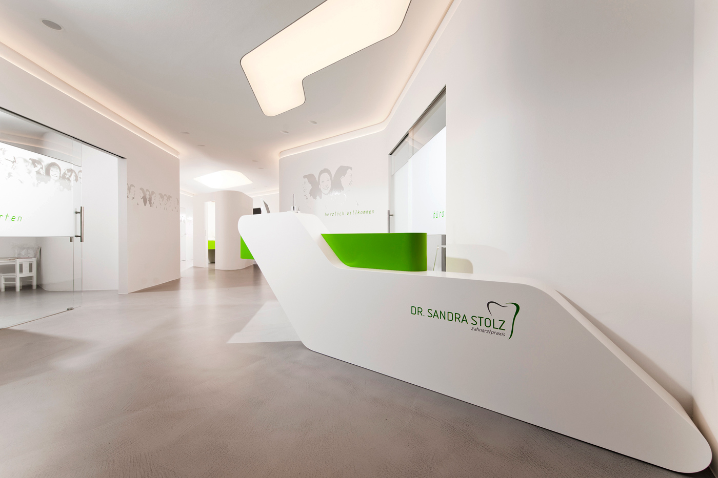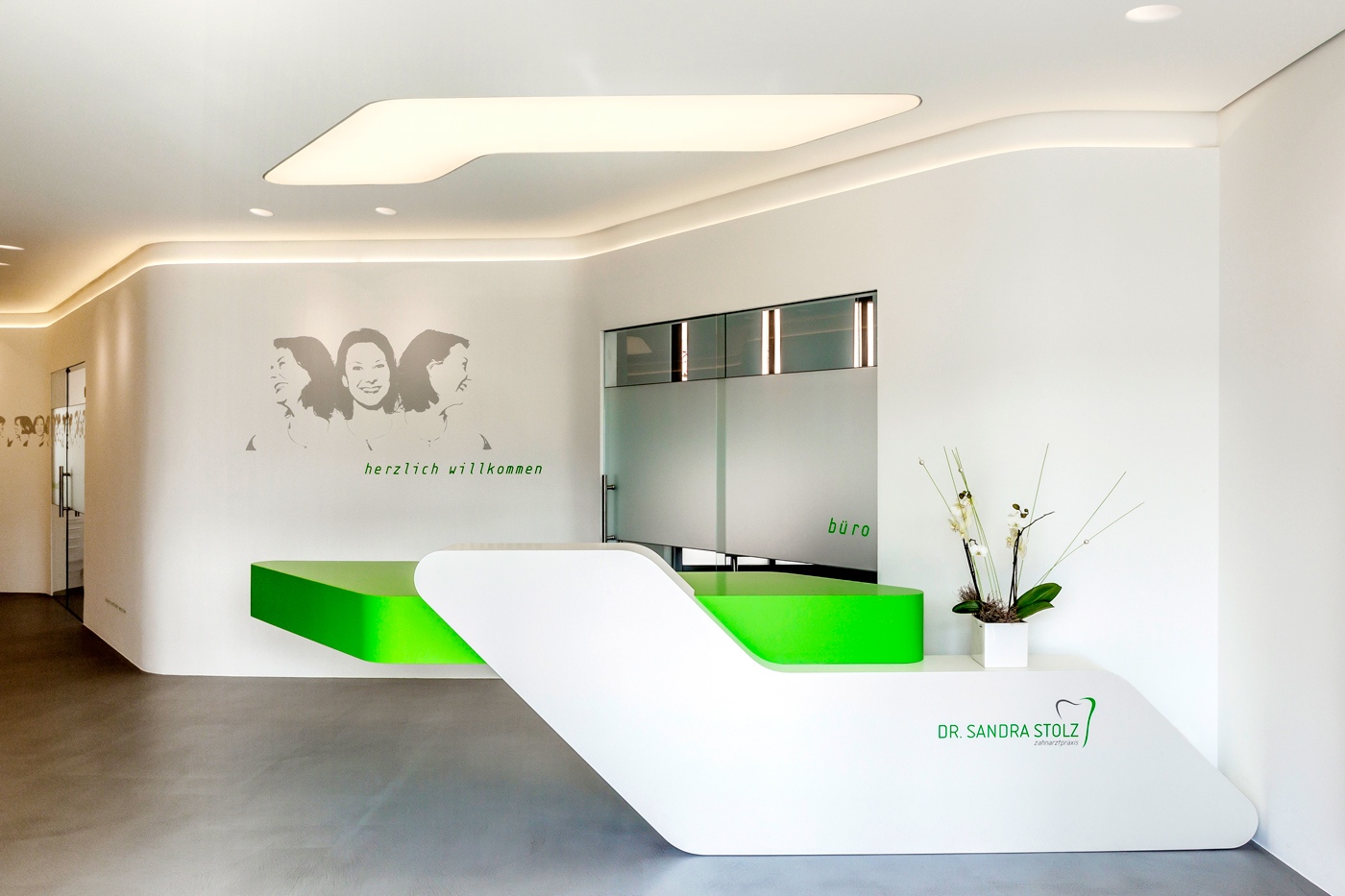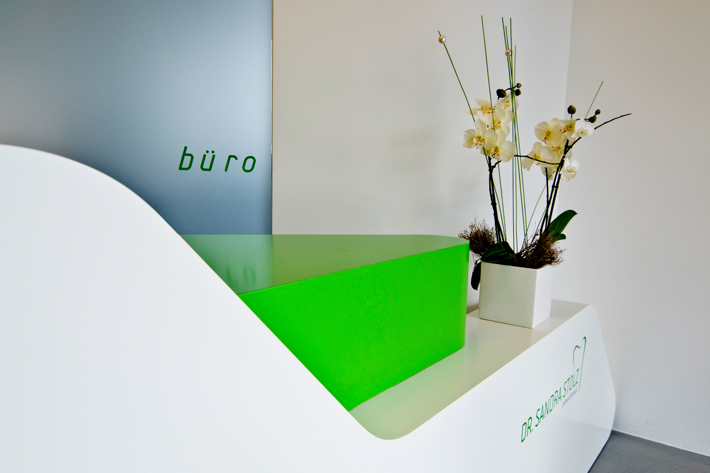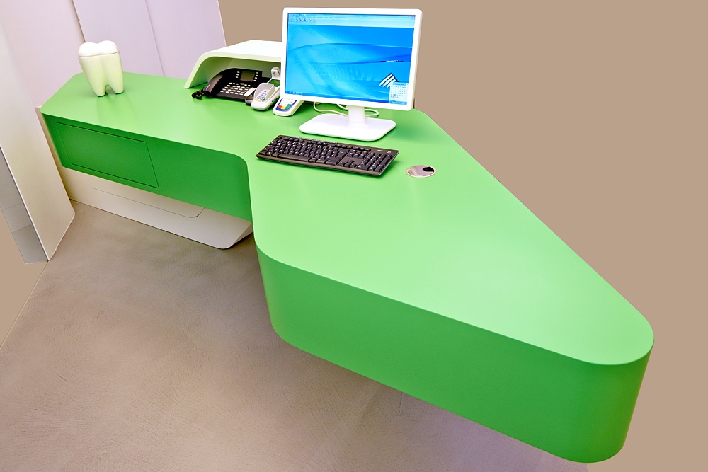 Die Theke ist Teil eines Architekturentwurfs für eine moderne Zahnarztpraxis in Langenfeld. Der Entwurf gab lediglich Abmessungen und Form vor. Die technische Umsetzung oblag unserem Handwerksbetrieb.