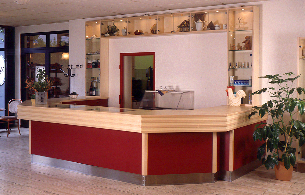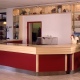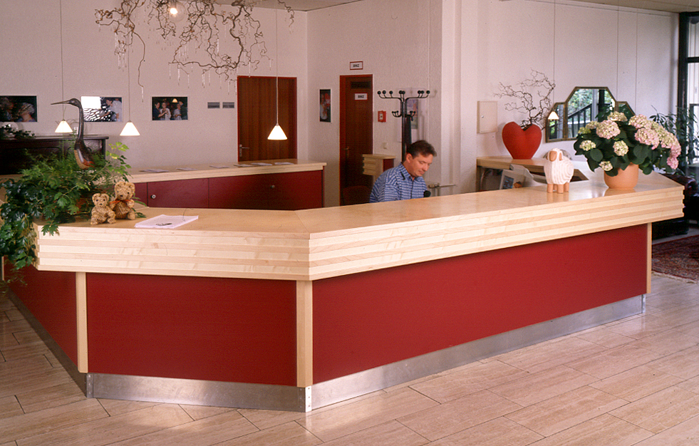 Was für ein Empfang: warmes Rot und helles Holz. Die Empfangstheke im Seniorenhaus ist aus Ahorn, Laminat und Edelstahl. Dazu passend: das Kiosk im gleichen Raum gegenüber.