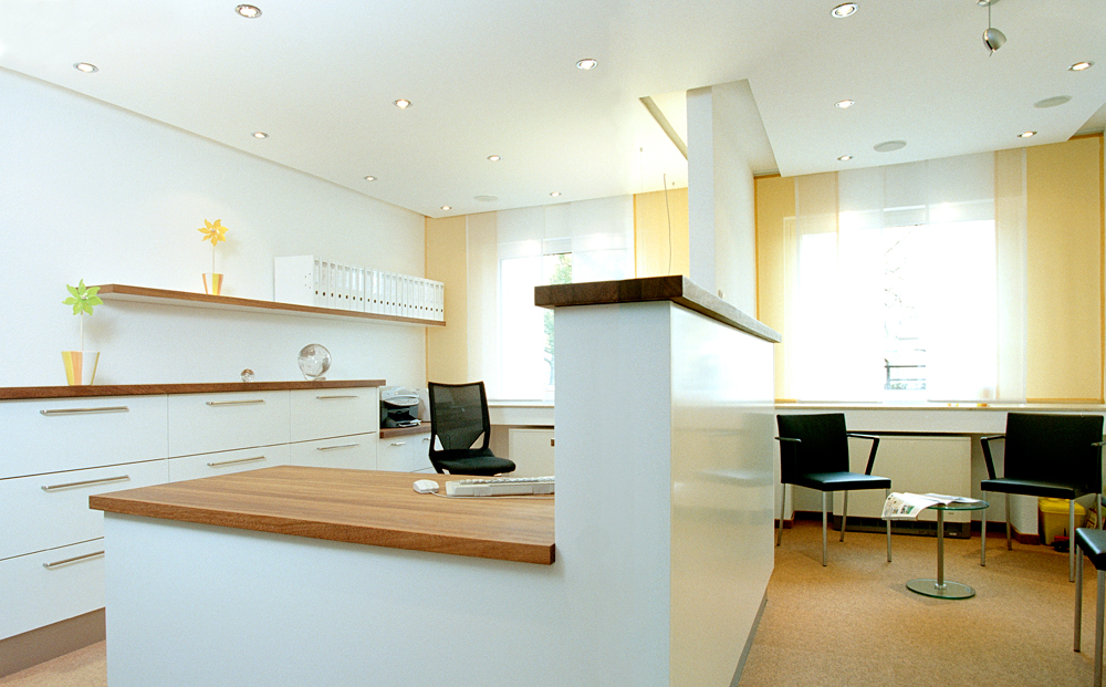 Ein warmes Willkommen in sonnigen Farben: So haben wir Empfang und Arbeitsbereich in einem Zahntechnik-Labor gestaltet.