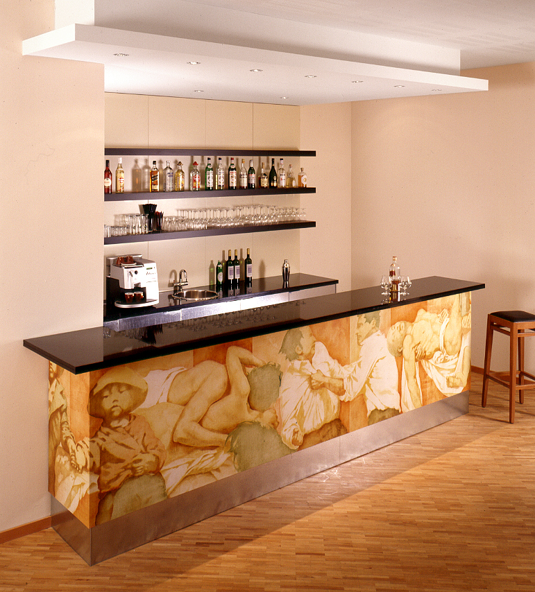 Lounge Rheingold: Schlicht in der Form, respektlos in der Materialwahl. Schwarzer Granit und Möbelfronten aus verzinktem Blech – eine gewagte und dennoch gelungene Komposition. Das Gemälde der Thekenfront (Öl auf Leinen) ist ein Werk zum Thema "Kommunikation" des Kölner Künstlers und Anfertigers Thomas Aust.