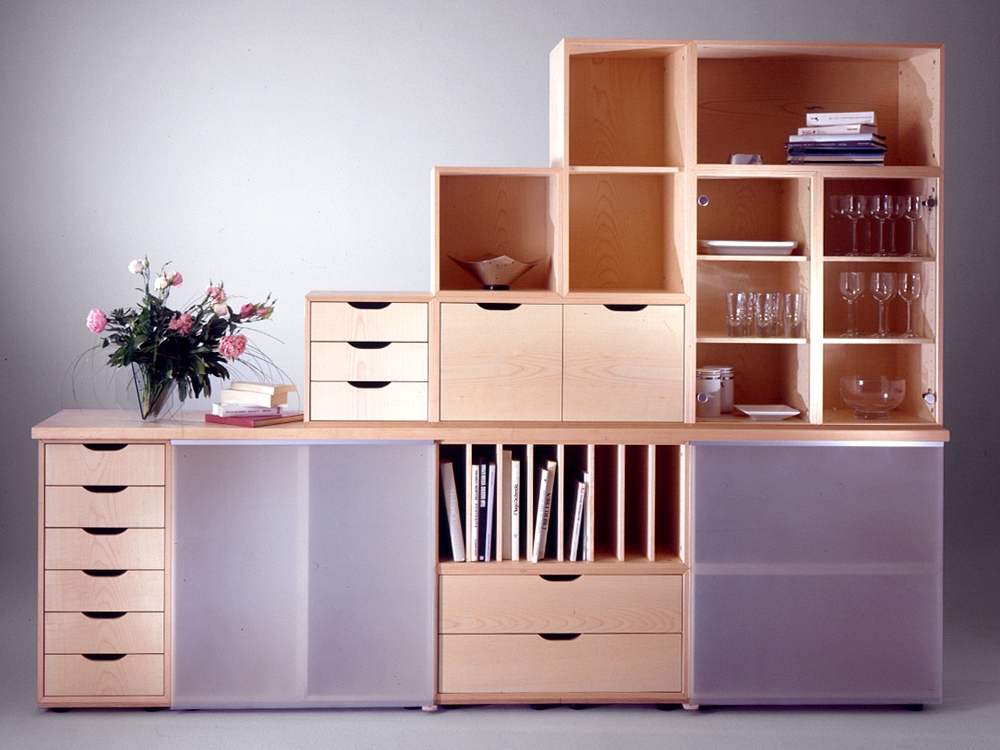 Stapeln Sie hoch, stapeln Sie nebeneinander: Die Kisten aus Ahornfurnier können Sie zusammen setzen, wie es Ihnen beliebt. Die Schiebetüren sind aus satiniertem Glas.