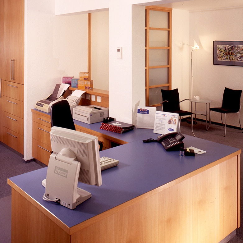 Wenn eine Praxis so freundlich gestaltet ist, nimmt der Patient doch gerne eine ganze Weile im Wartezimmer Platz, oder? Zahnarztpraxis: Kunststoff beschichtet, Buche furniert. Trennwand aus satiniertem Schallschutz-Glas mit Buchenrahmen.